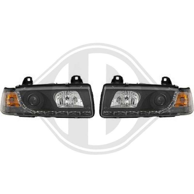 BMW E36 mustad disain esituled, LED päevasõidutuled ECE R87 märgistusega, H1/H1, el. kõrguse reguleerimine. Komplektis parem ja vasak esituli. Sobib 1990-1999 3-seeria BMW E36 sedaan ja universaal kerega mudelile.
